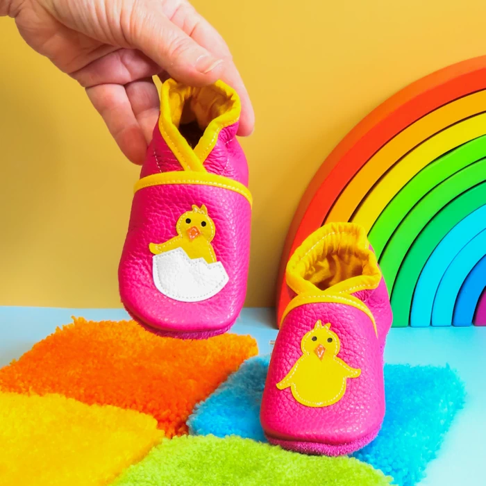 💗 Deux poussins sur ses pieds, et voilà bébé prêt à gazouiller, marcher, rigoler ! Des chaussons tout doux, tout roses, cousus main avec le cœur.